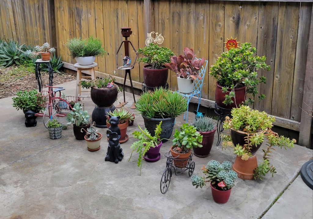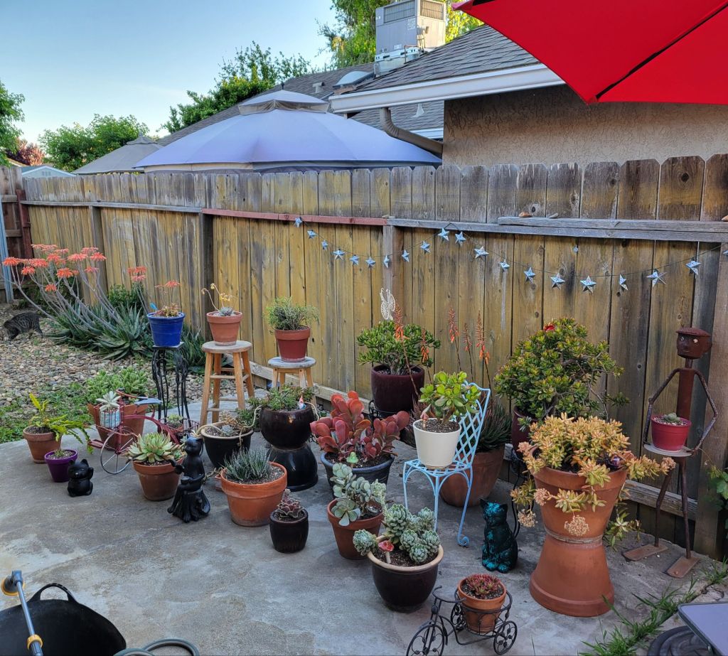 We moved the potted succulents back out by the fence after the risk of frost passed: