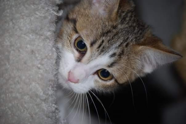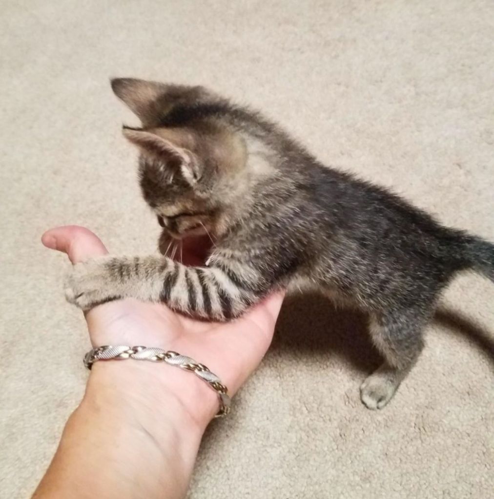 Over 2 years ago, my Avon lady saw someone dump a kitten in a city lot, she scooped up the l’il, 3-week- old, tabby scruff, took it home, and cared for it for a month.