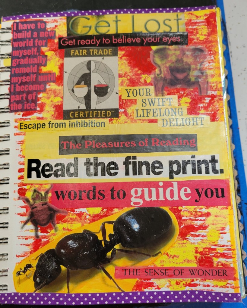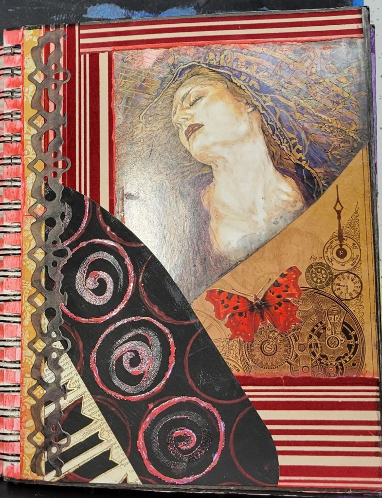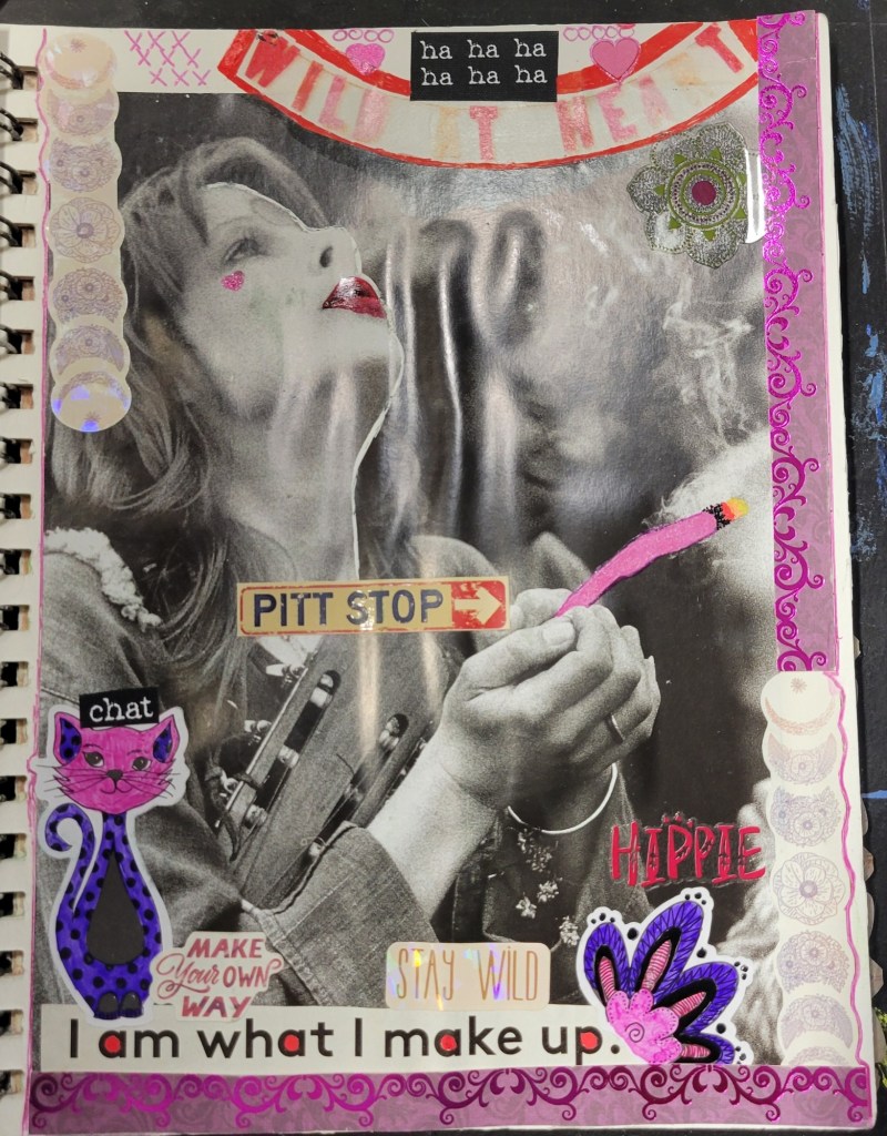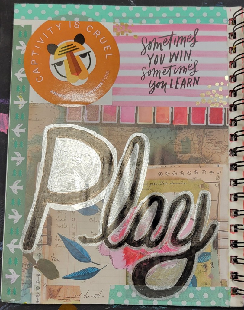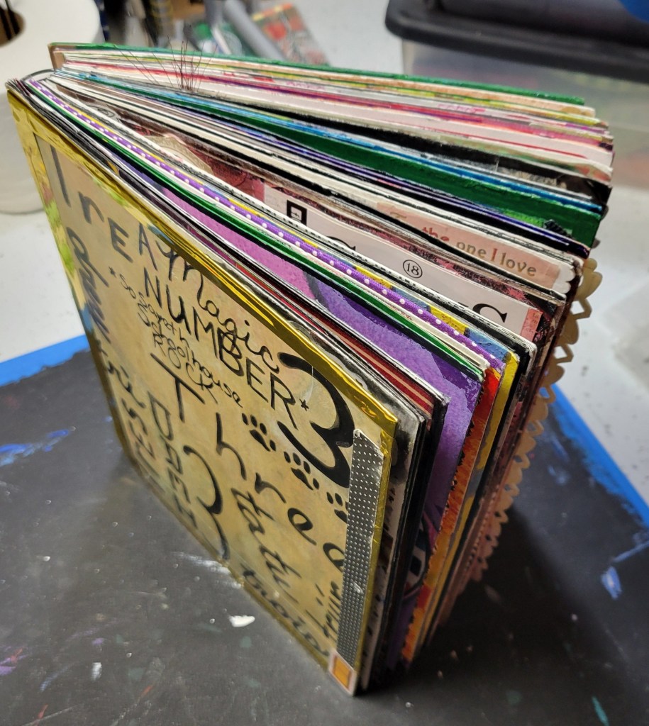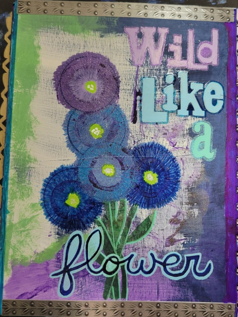 Ingredients: acrylic paint & mediums, artist pens, colored card stock, scrapbook and found papers, craft jewels, leather & suede, UV protective sealer, PCH*.