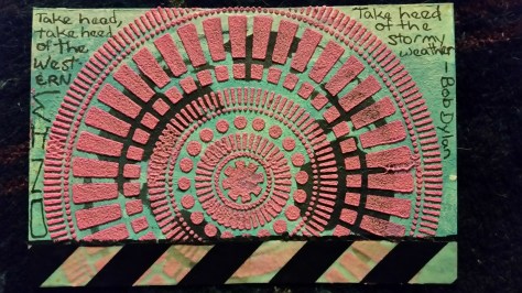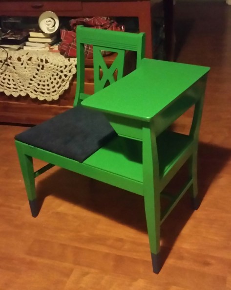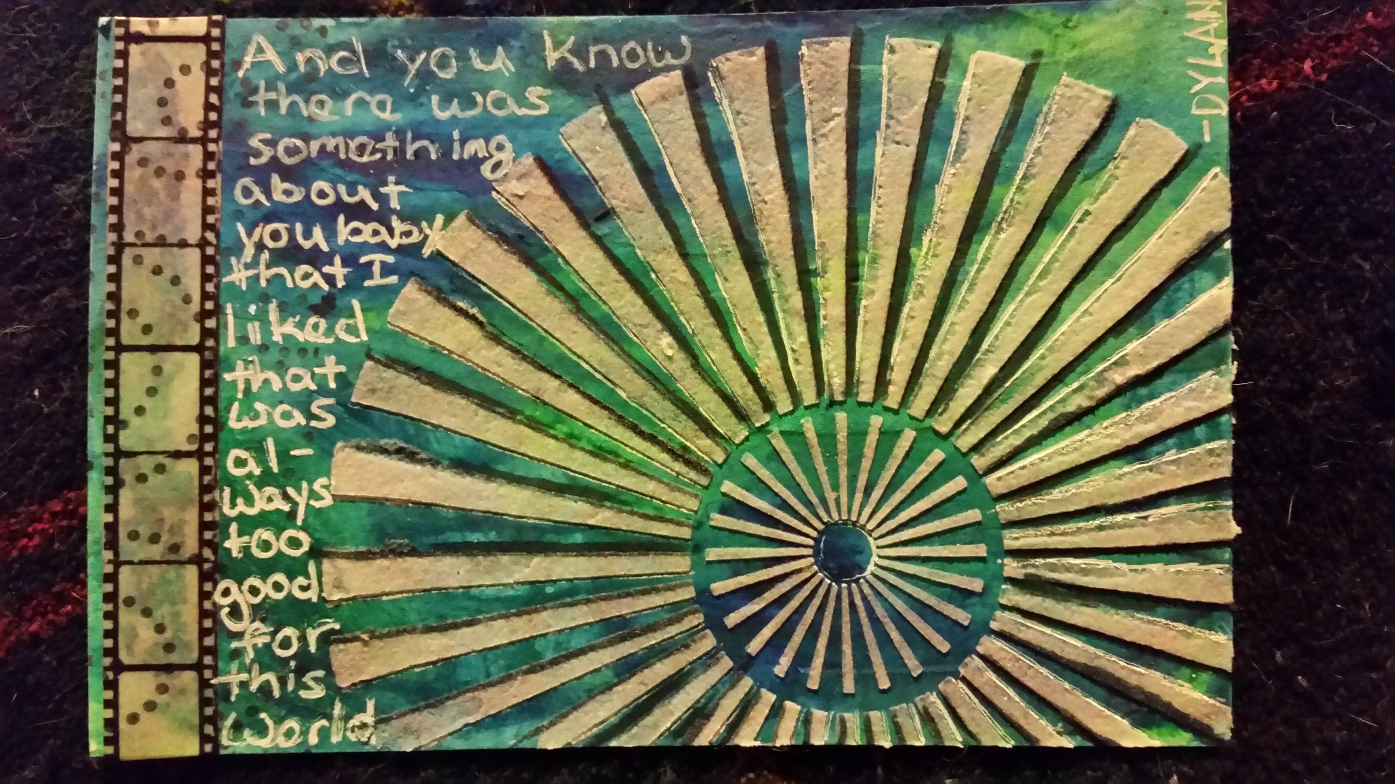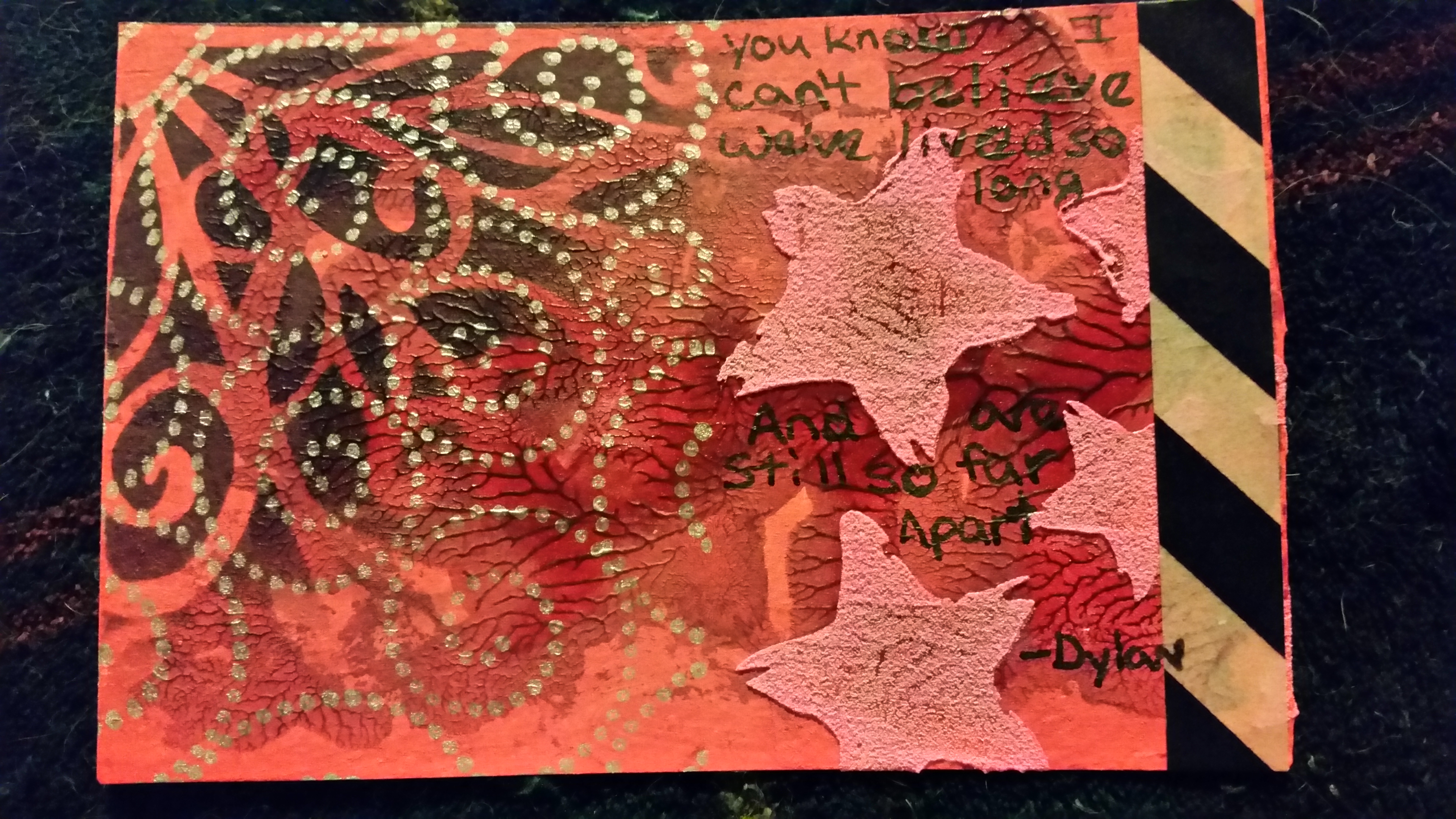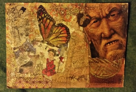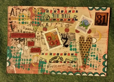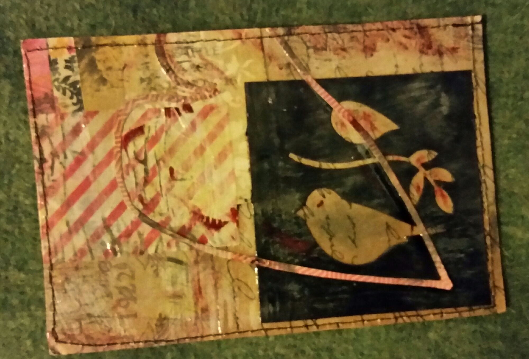 While I have done practically nothing in my art journals since last summer until recently, I have tried to keep my hand in the paint, so to speak. I participated in iHanna’s postcard swap last fall (had them sent to my Sister-in-law’s address, as I was moving at the time), did the spring swap, and I just finished my postcards for the this year’s fall swap. Also, I FINALLY (seriously, I’ve had it for about 20 years!) redid my telephone “lefty” table,