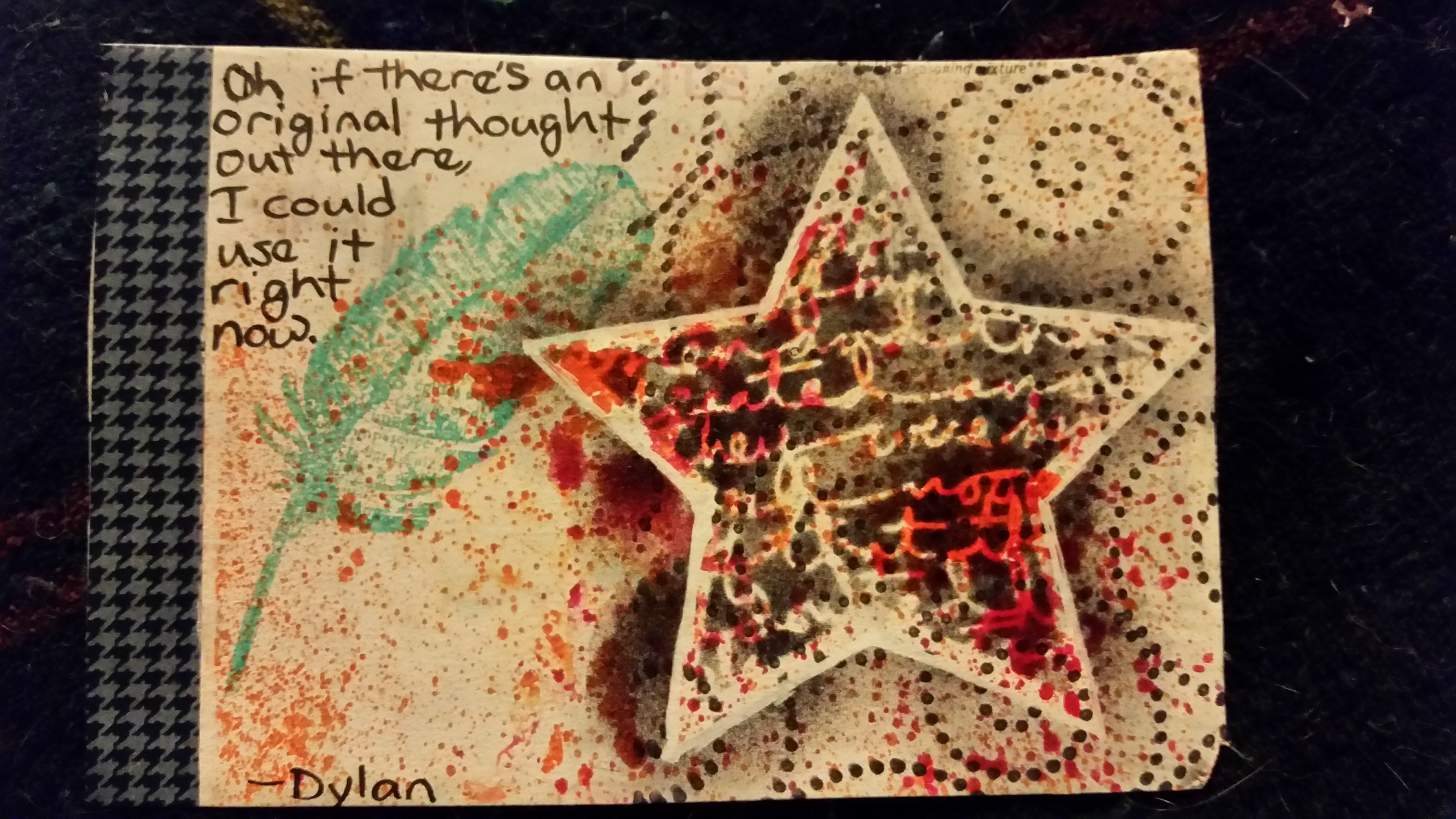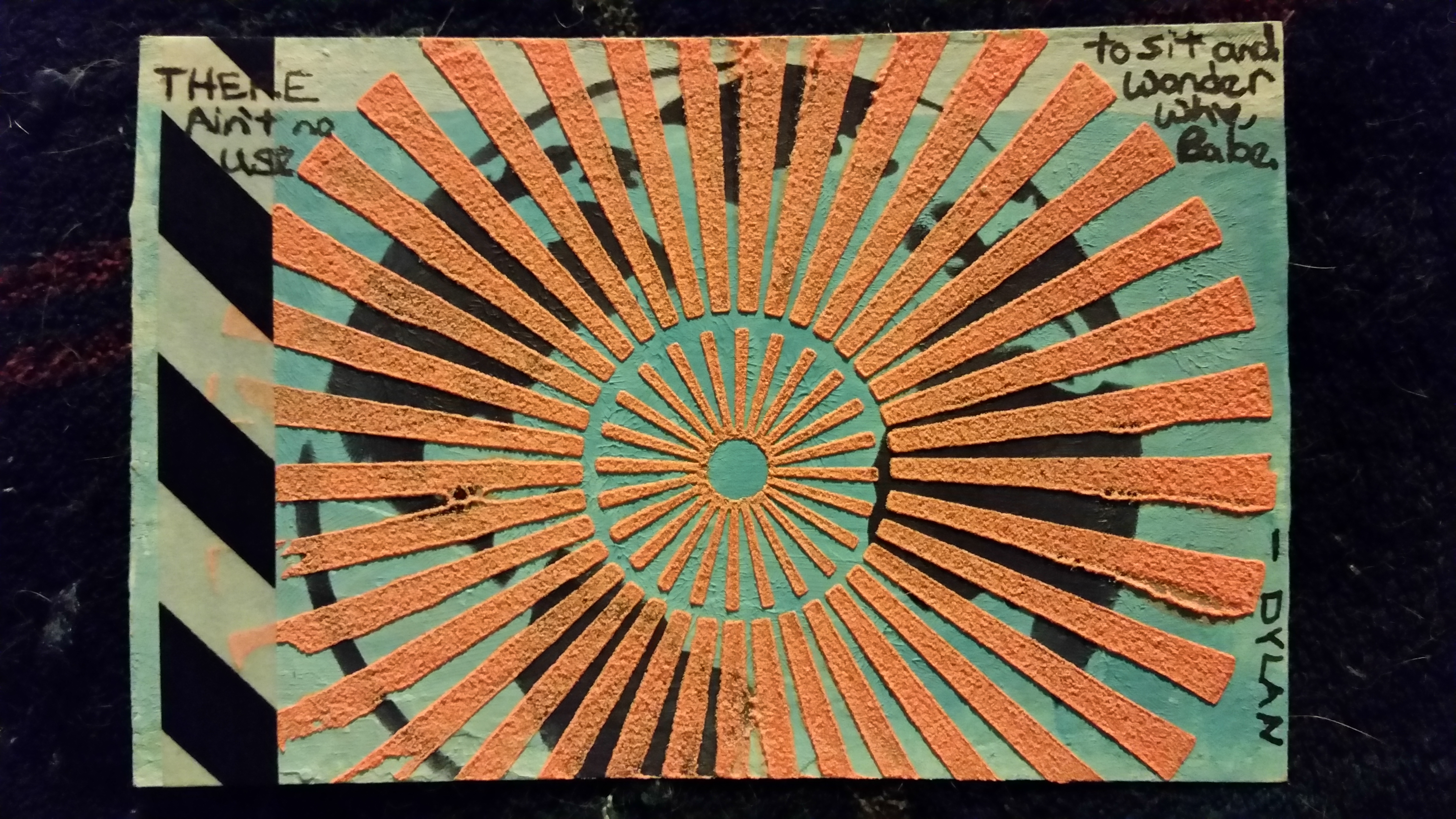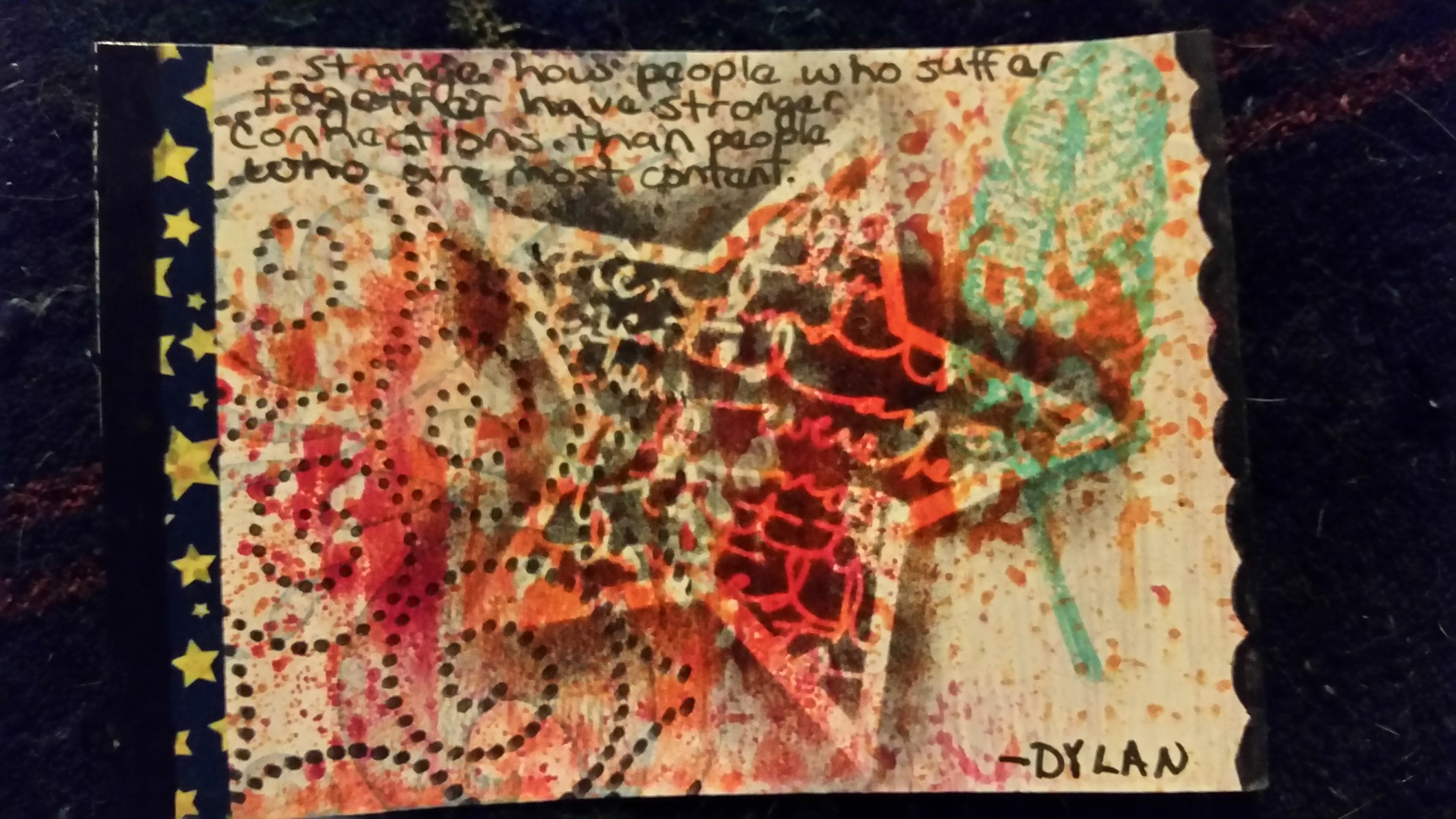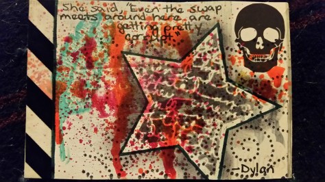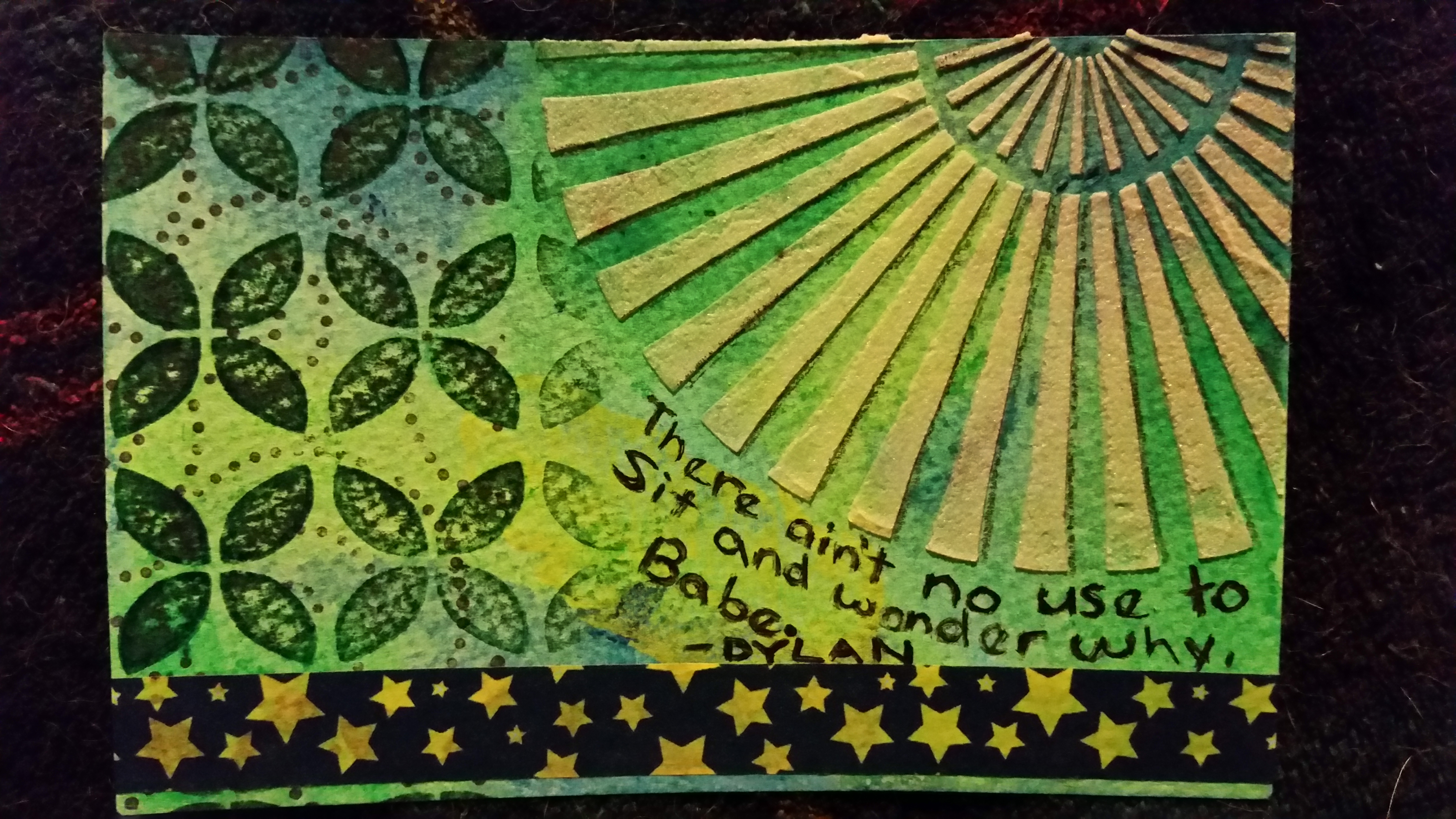 While I have done practically nothing in my art journals since last summer until recently, I have tried to keep my hand in the paint, so to speak. I participated in iHanna’s postcard swap last fall (had them sent to my Sister-in-law’s address, as I was moving at the time), did the spring swap, and I just finished my postcards for the this year’s fall swap. Also, I FINALLY (seriously, I’ve had it for about 20 years!) redid my telephone “lefty” table,