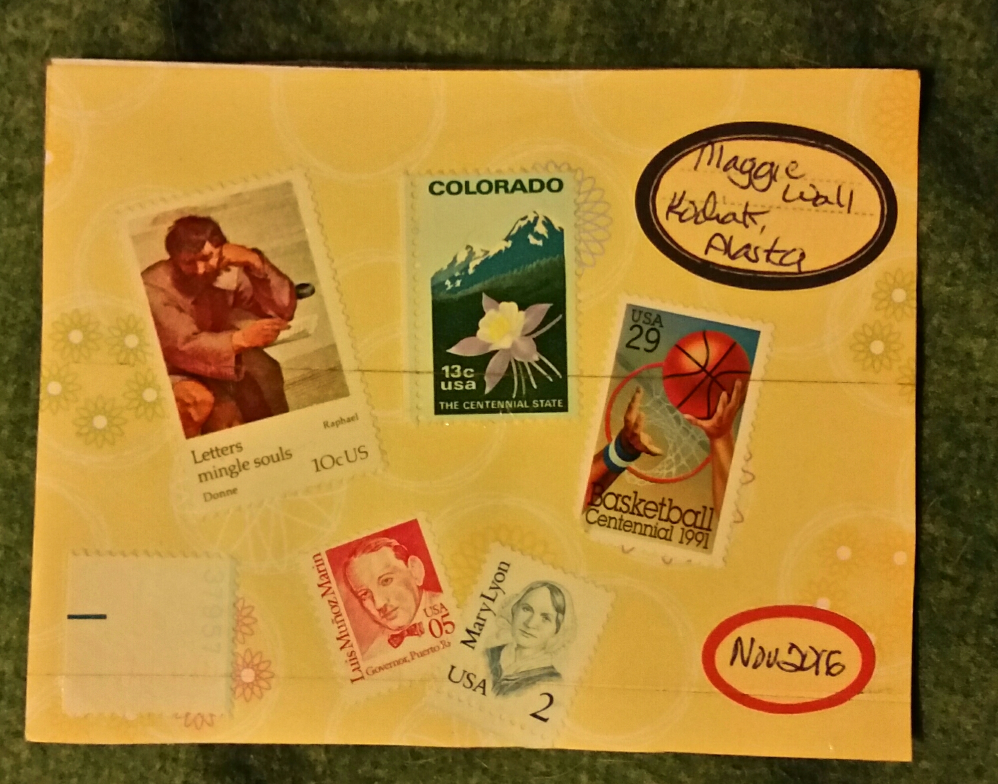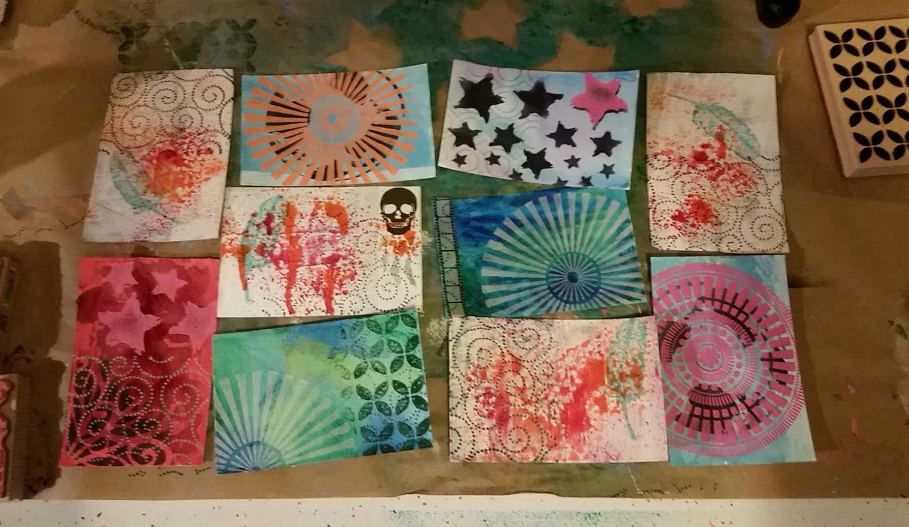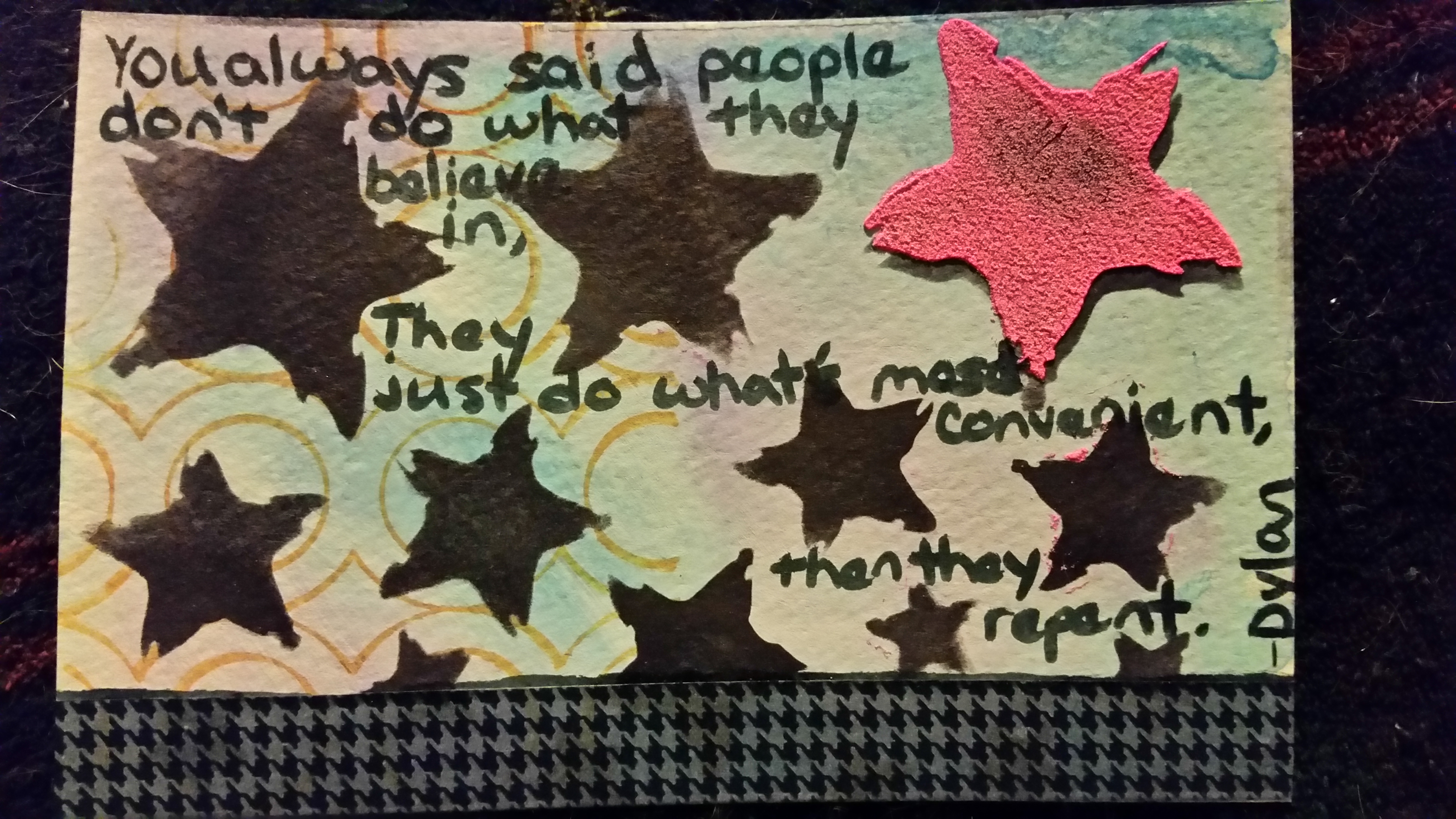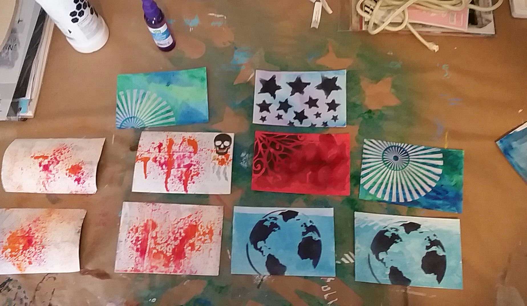 While I have done practically nothing in my art journals since last summer until recently, I have tried to keep my hand in the paint, so to speak. I participated in iHanna’s postcard swap last fall (had them sent to my Sister-in-law’s address, as I was moving at the time), did the spring swap, and I just finished my postcards for the this year’s fall swap. Also, I FINALLY (seriously, I’ve had it for about 20 years!) redid my telephone “lefty” table,