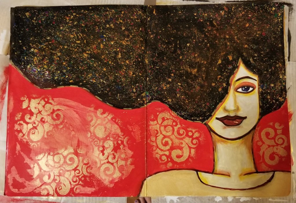 After I covered her glittery hair with nickel azo gold, I used a stencil to put the swirly gold marks.