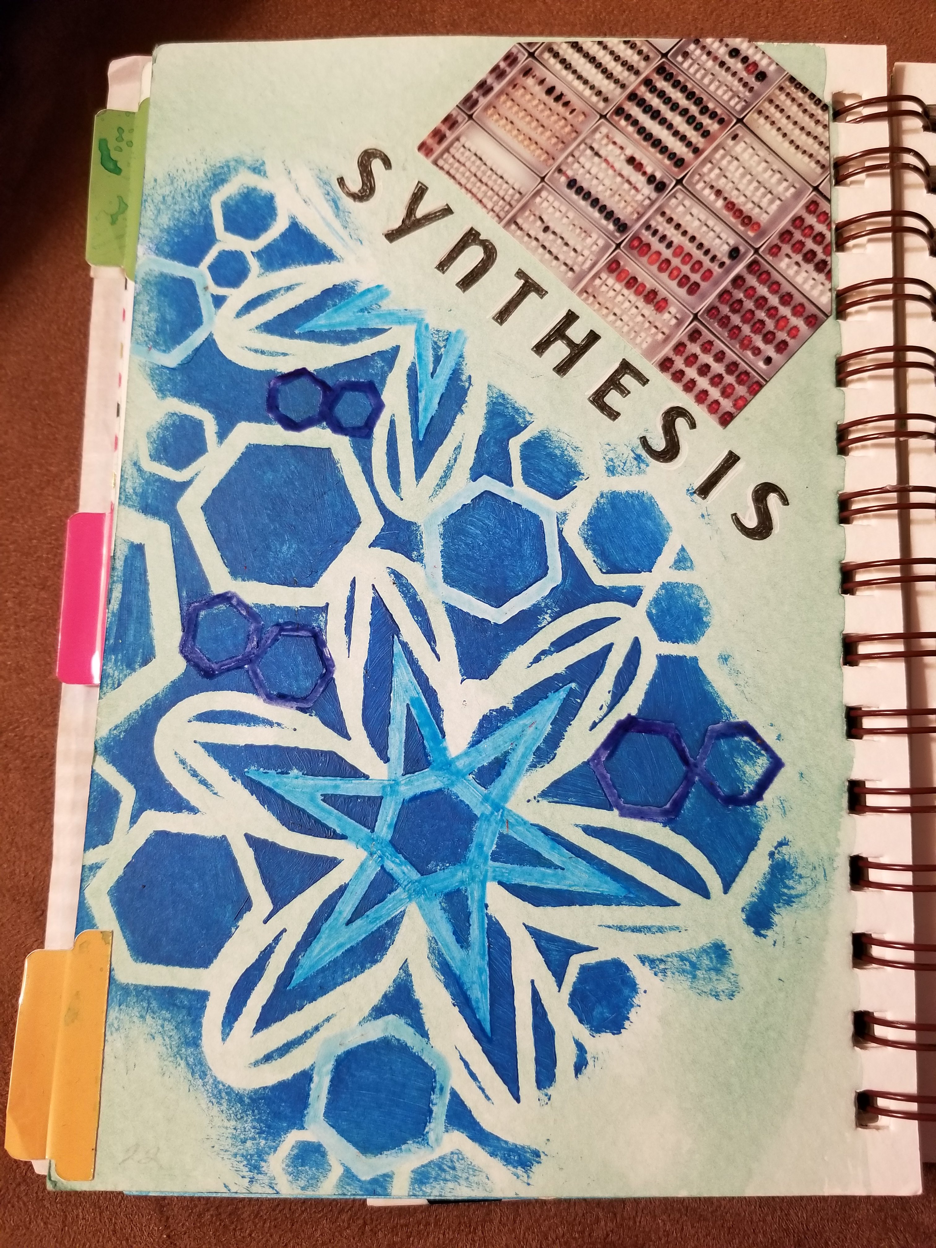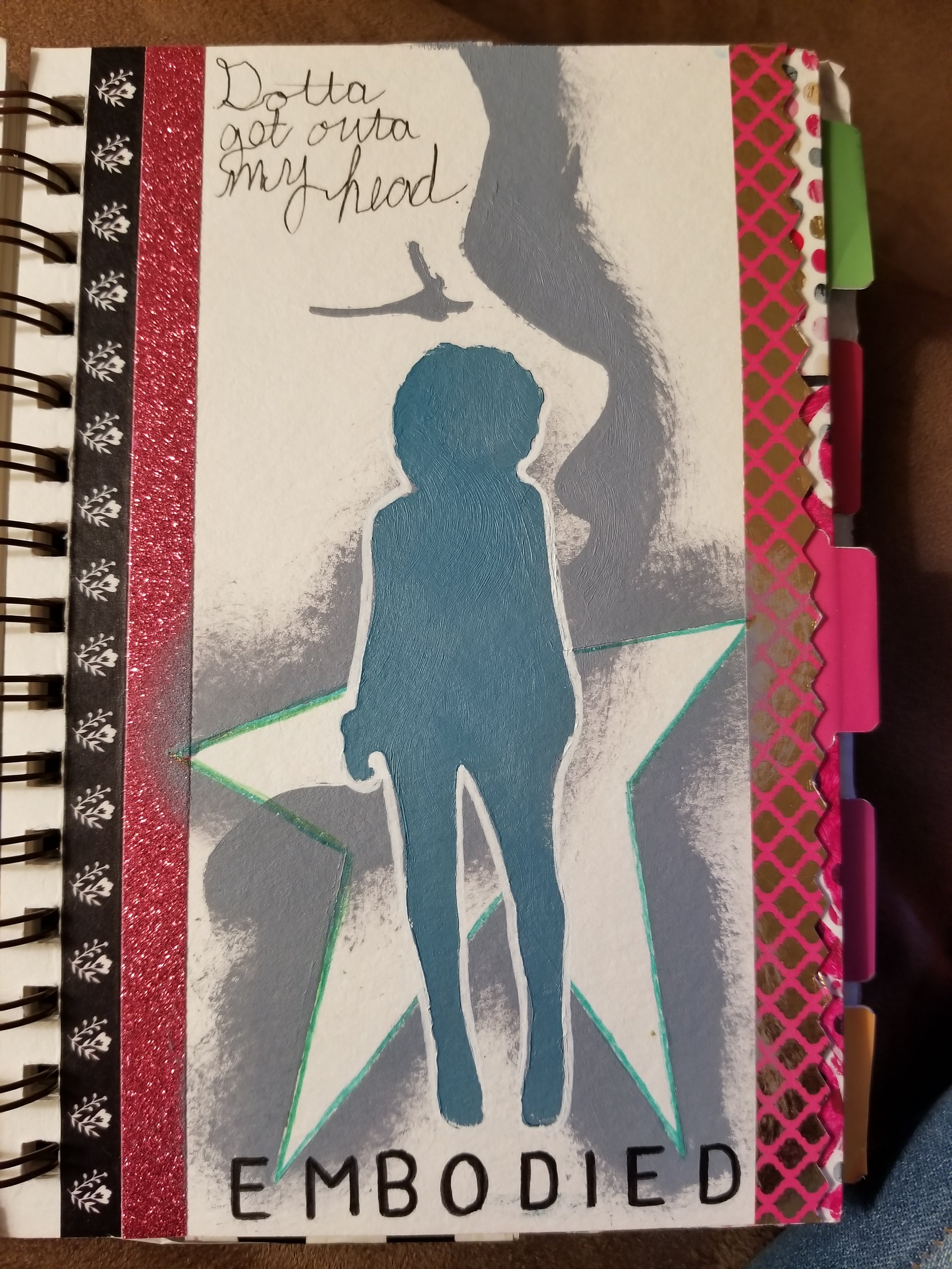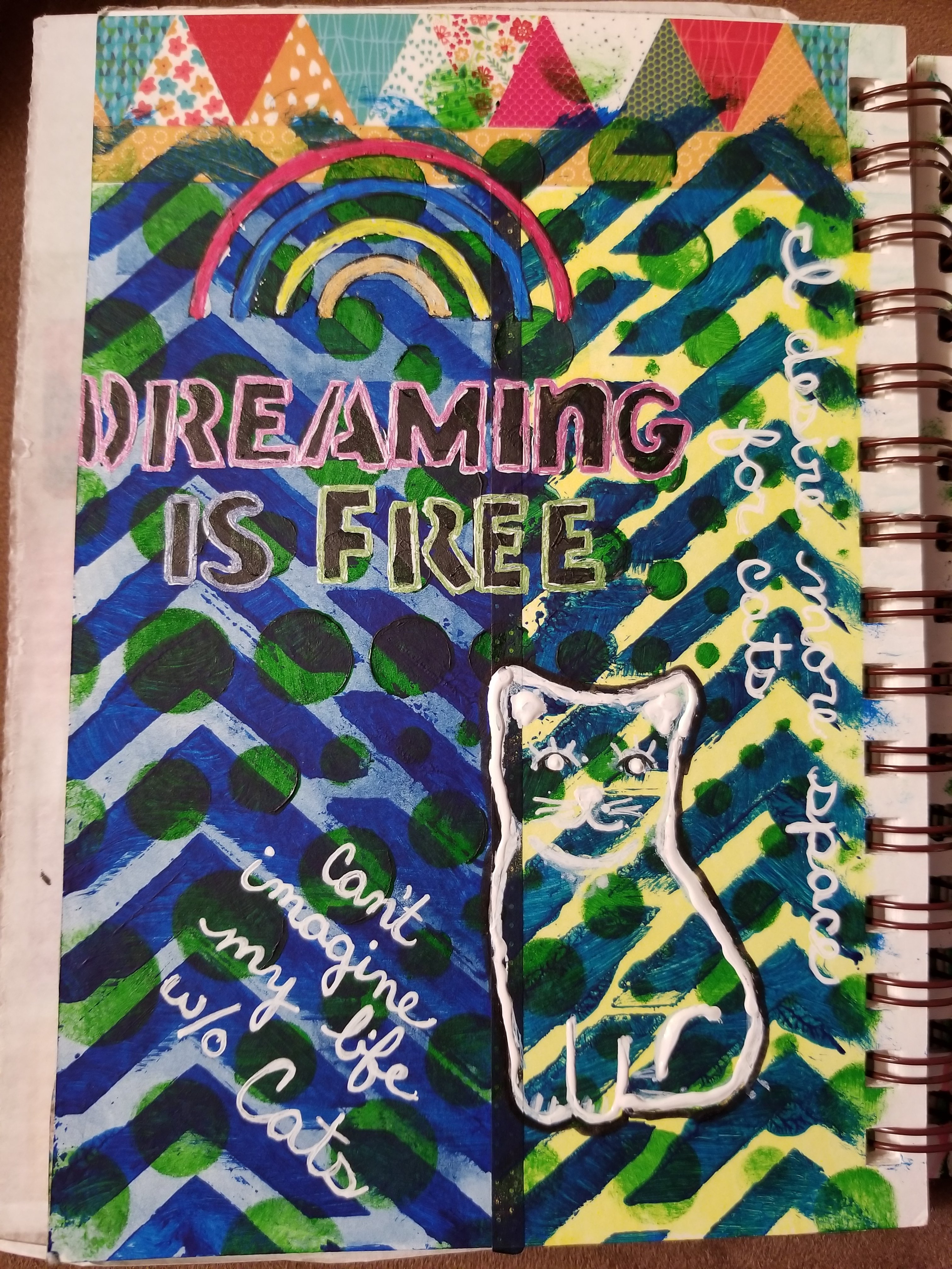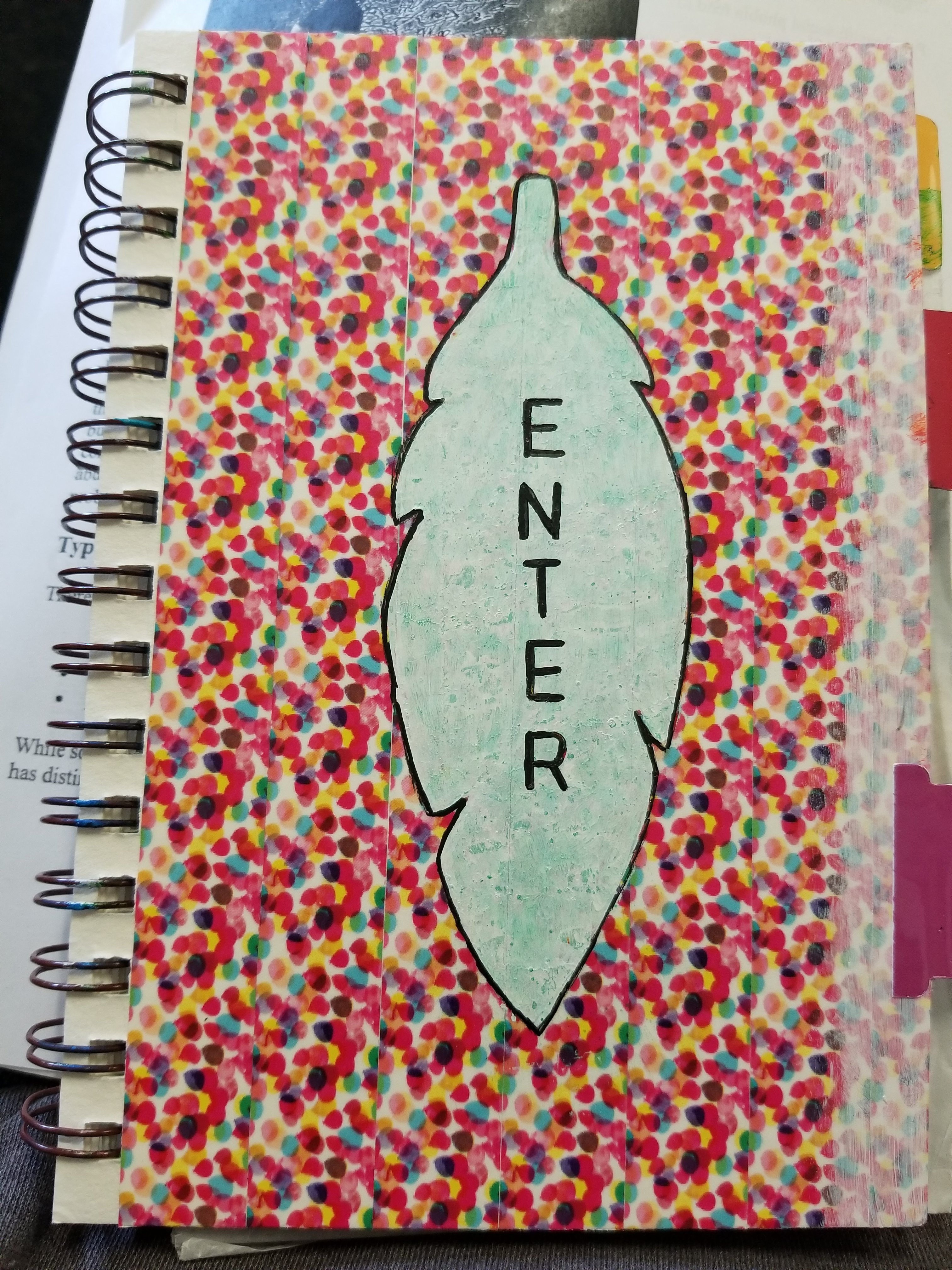 With that, here’s my book. I didn’t seal the pages with gesso before I started, so there were limits on what I could add (wet media and such) but it was cool to work on it anyway.