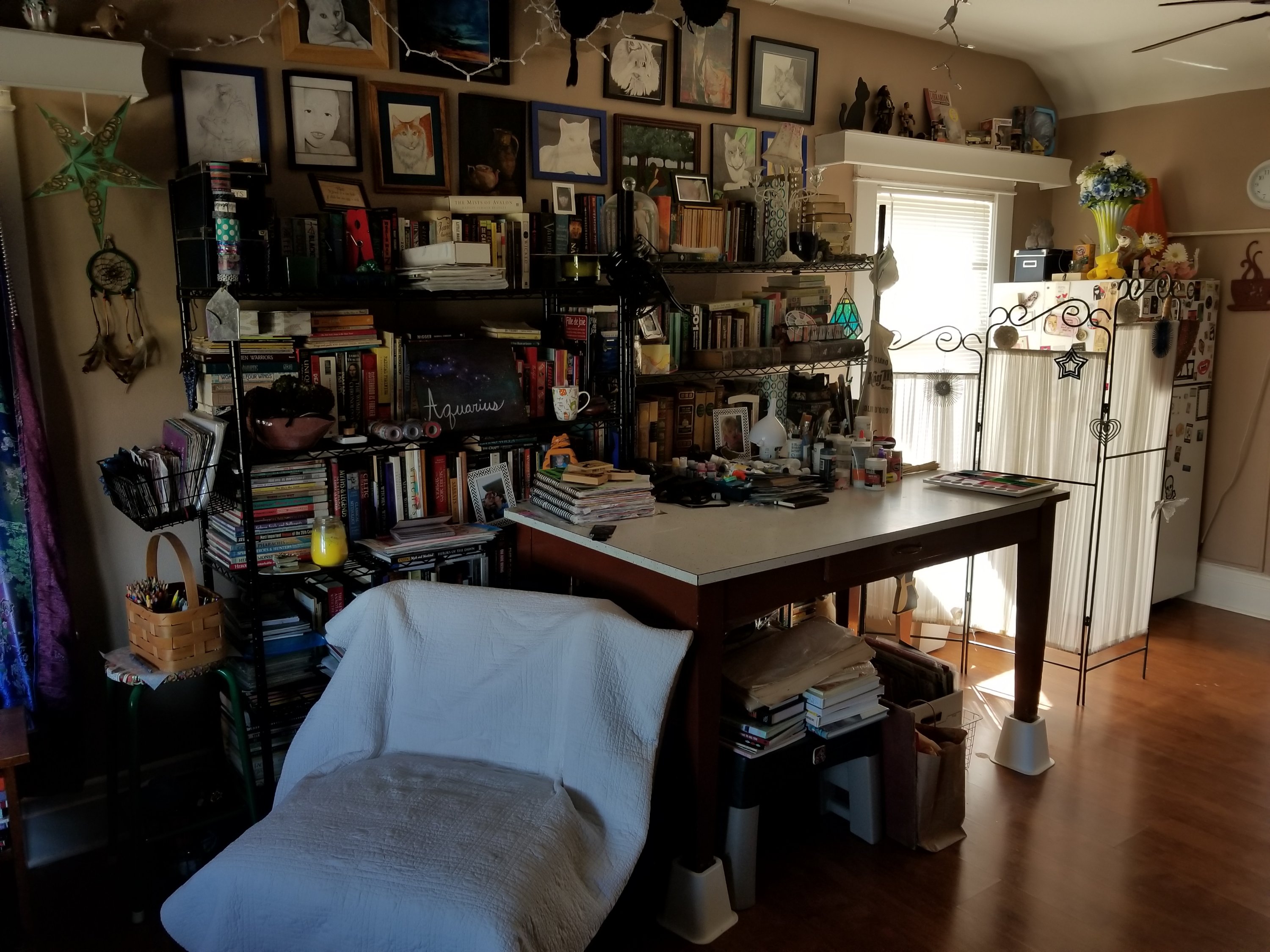 I have a room full of art supplies, but my art table is in my living room. There is more room out here, I listen to music while I make the art, and the cats are more comfortable out here.